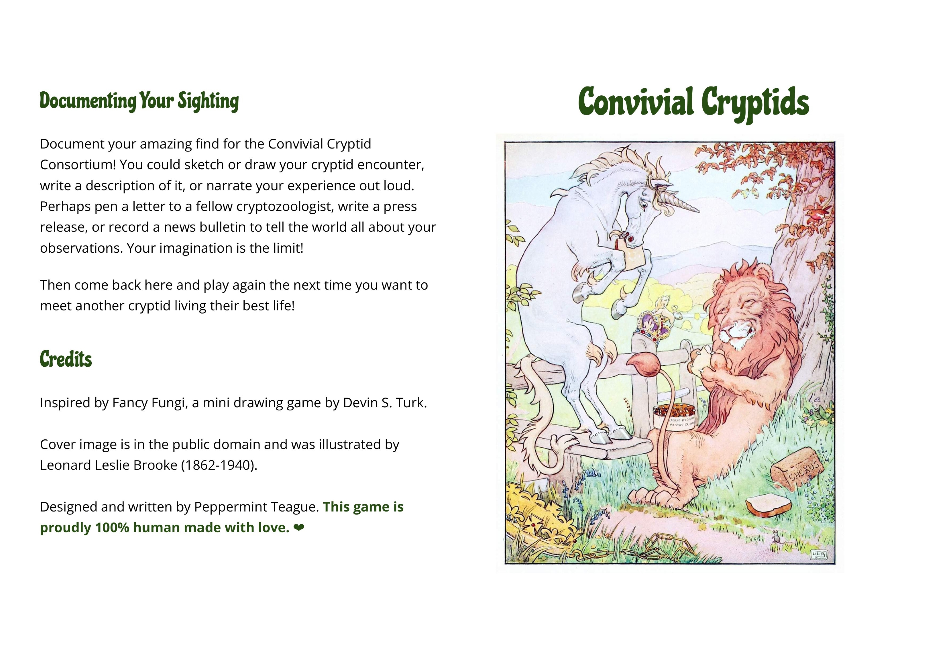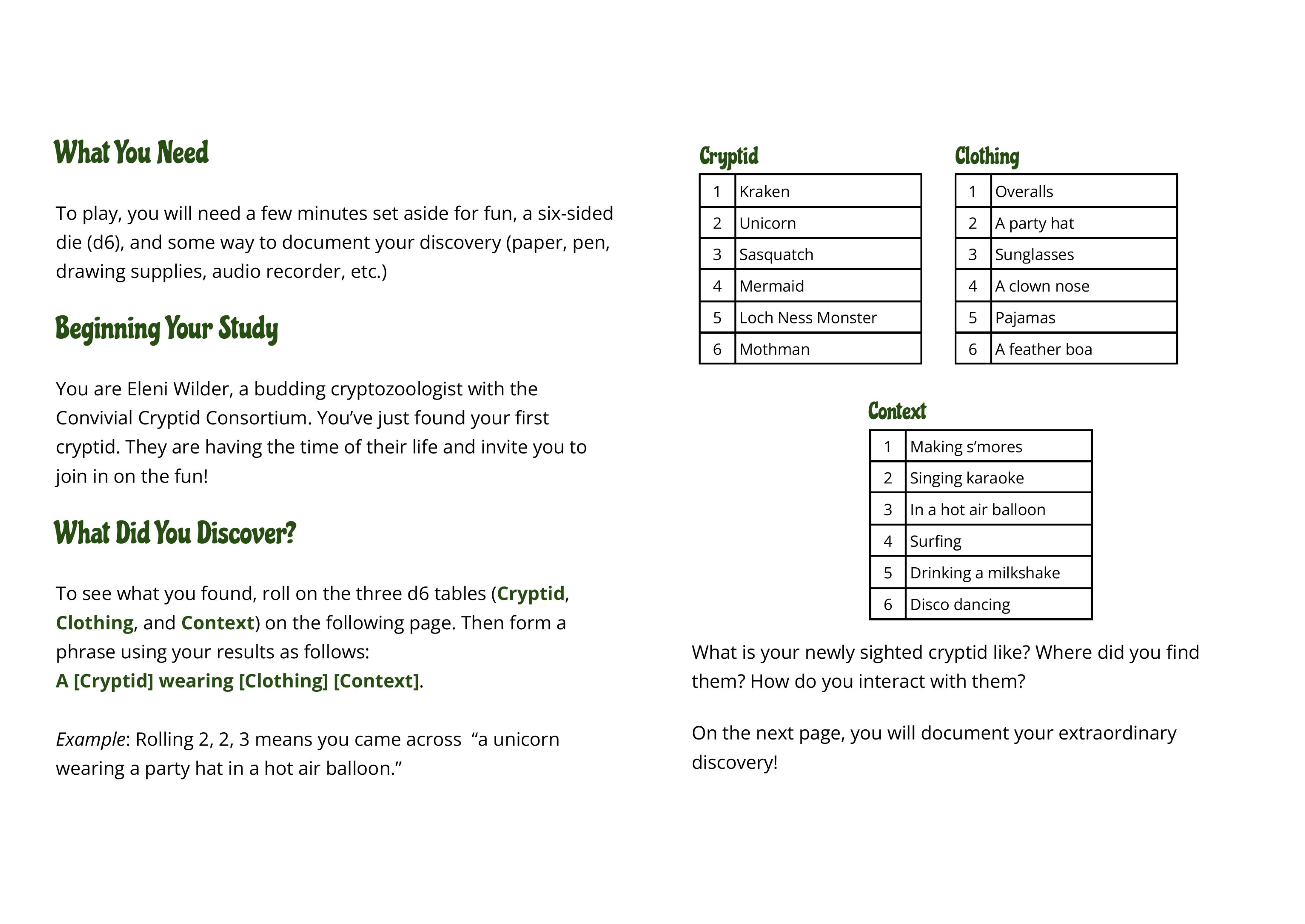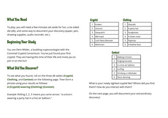 Convivial Cryptids is designed to be printed and then folded like a greeting card. Print double-sided in landscape orientation, flipping on the short side. To prevent bleedthrough, consider printing to heavy paper or cardstock. Then fold the document in half with the cover image facing out, as if it were a greeting card. Easy! Now you are ready to play.